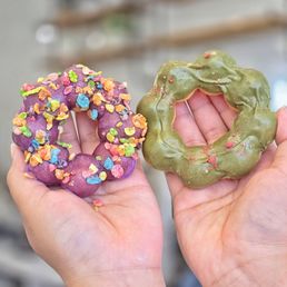 I was really craving mochidonuts. Like really badly. We stopped by on our date night and my husband treated me to a fruity pebble mochi donut and a crème brulee mochidonut. Both were so good. I wasn't expecting to like the fruity pebble one but the cereal actually complimented the donut well. And crème brûlée had a cream on it which I thought was good too. Both had great mouthfeel and balance of sweetness. My husband also got himself a spicy pineapple crème something drink. I don't like pineapple flavored drinks so I didn't try it but he enjoyed it. Pricing is fair and the interior is really cute. Like kawaii cute.